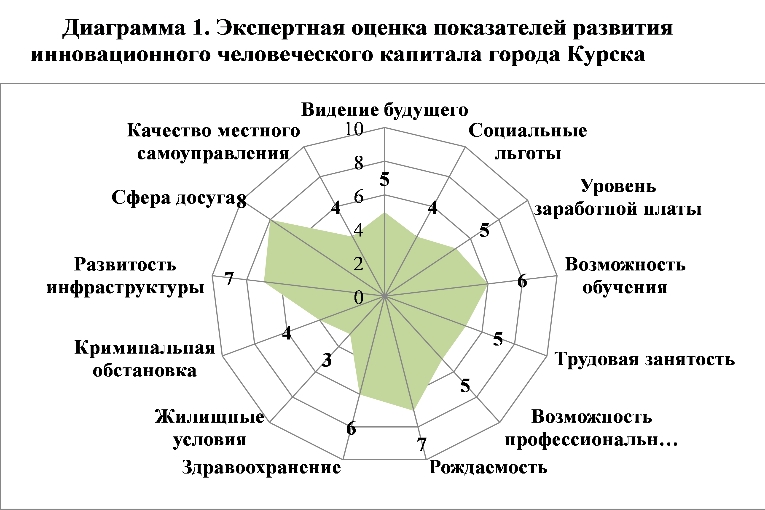Стоит отметить довольно пессимистичную экспертную оценку данных показателей развития инновационного человеческого капитала города Курска (см. Диаграмма 1).