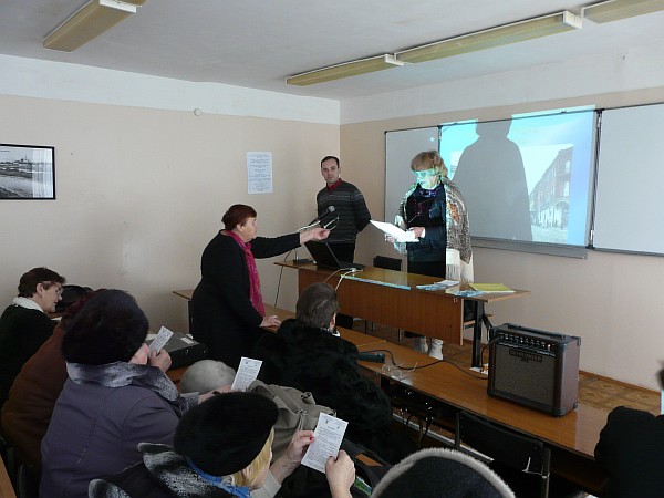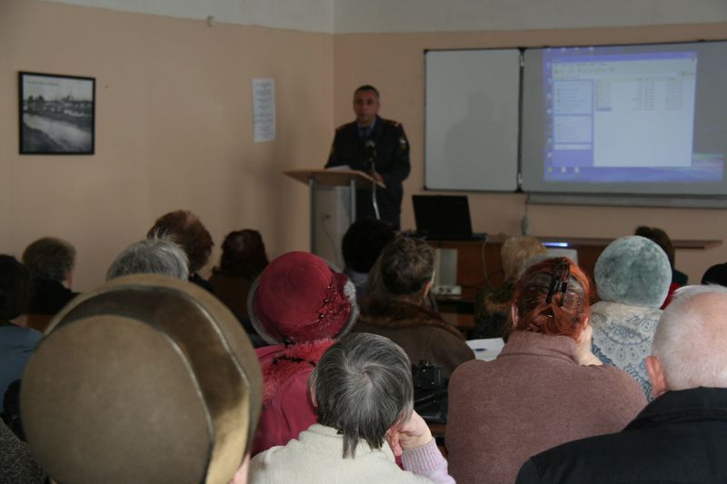 27 февраля в Доме знаний состоялось очередное занятие университета сеньоров, которое провёл подполковник УМВД Курской области Воднев В.Г. Он рассказал о направлениях в работе участковых полицейских, о борьбе с самогоноварением, игорным бизнесом, мошенничеством. Было приведено много примеров разного вида мошенничества : разносная торговля, телефонное мошенничество, заказ товаров через интернет ,приход в дом мошенников под видом медицинских или социальных работников и др. Слушателям показан фильм " Подонки",сделан анализ поступков героев фильма.