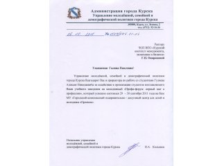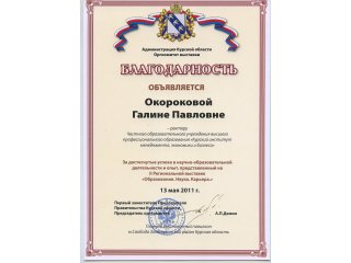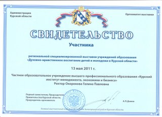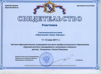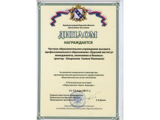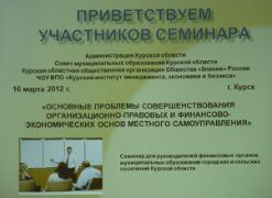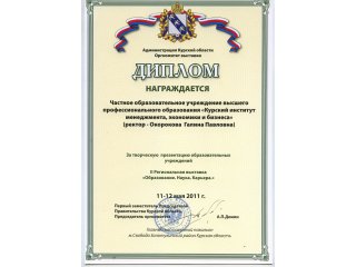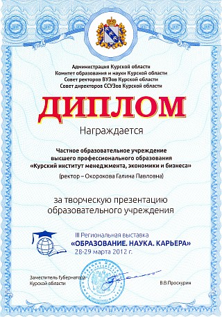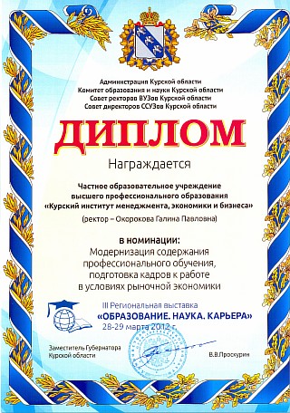 Так, с ноября по декабрь 2012 года профессорско-преподавательский состав Курского института менеджмента, экономики и бизнеса осуществлял обучение муниципальных служащих г.Курска по дополнительной профессиональной образовательной программе "Государственное и муниципальное управление". Слушателям были предложены программы по вопросам этики и культуры делового общения (лектор Воронцова Г.Н., доцент), организационному поведению (лектор Гусева И.В., к.п.н.), экономике и финансам муниципальных образований (лектор Кликунов Н.Д., профессор, к.э.н.), проблемам правового обеспечения деятельности органов местного самоуправления (лектор Салпанов Н.М. - зам. председателя комитета по организационному обеспечению Курской областной Думы) и другим.