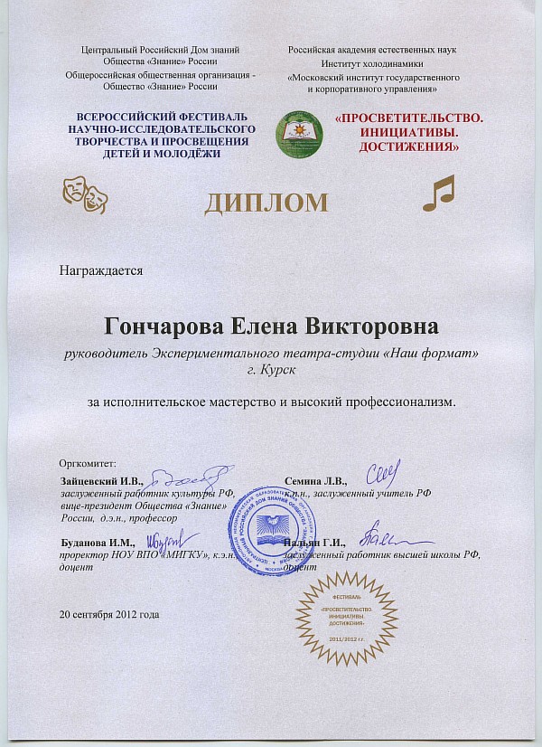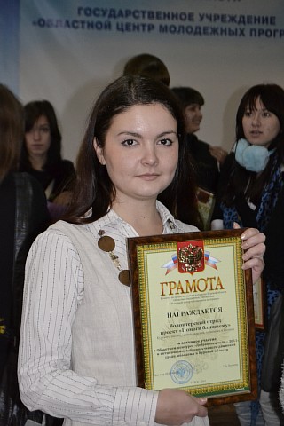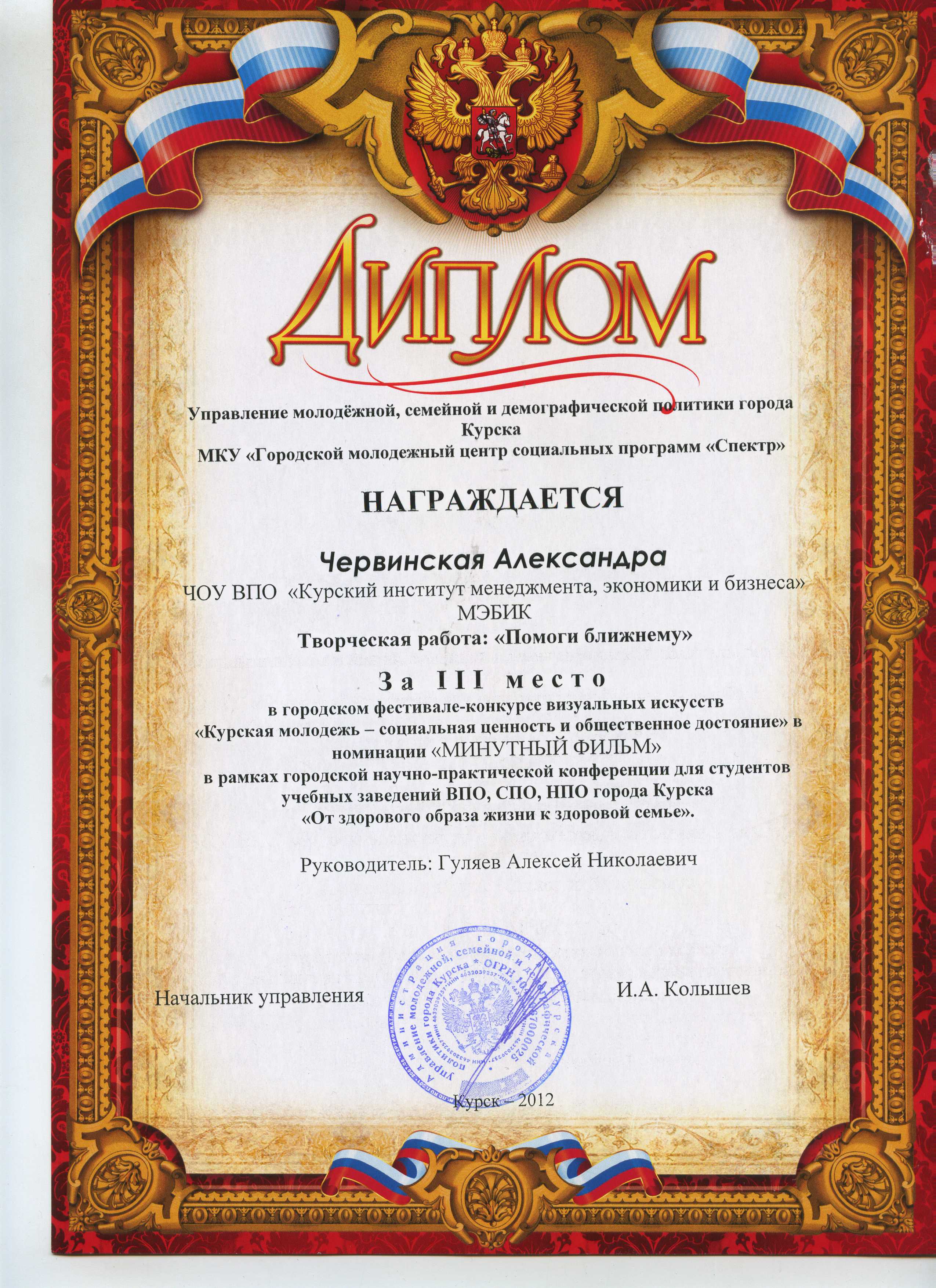 Александра Червинская, студентка 5-го курса факультета подготовки бакалавров - талантливая скрипачка, неоднократно прославлявшая институт на конкурсах инструментальной музыки, классического вокала. Александра - участница рок-группы "Айвенго" (Лауреата Всероссийского конкурса "Всероссийская студенческая весна"), председатель студенческого совета института 2011 года, специалист-организатор мастер-классов и т.д. Вместе с тем, Александра придумала и вместе со студентами нашего института реализовала проект "Помоги ближнему", по которому был снят конкурсный фильм, получивший Диплом фестиваля - конкурса визуальных искусств, организованного Управлением молодежной, семейной и демографической политики г. Курска в рамках городской научно-практической конференции "От здорового образа жизни к здоровой семье".