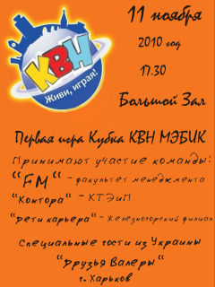 Состоялась плановая битва титанов - игра команд КВН нашего института - "Туши свет" и "Парадигма". Были представлены визитки команд, разминка и музыкальное домашнее задание. Честно говоря, описывать КВН - занятие неблагодарное, скажем только, что было просто классно, весело, забойно и здорово. И тот, кто не пришел - многое потерял (чтобы не сказать крепче:) И даже неважно, кто был первым (хотя это - "Туши свет"), поскольку обе команды участвовали 25 ноября в городской игре. Мы не заняли призовых мест, но сдаваться не собираемся!!!!
