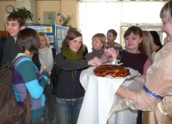 В 11.00 в кафе Дома Знаний состоялась первая встреча с немецкой делегацией. По старой русской традиции студенты МЭБИК встретили гостей с хлебом, солью, что было очень приятно для наших дорогих гостей.