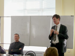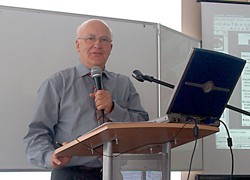 Обсуждение коснулось многих тем: налоги, государственный контроль, банки и кредит, безработица, общественные организации. Как оказалось, подоходный налог в Германии составляет 53%, государственный контроль малых и средних предприятий фактически отсутствует, безработица держится на уровне 8-10%, а 6% бюджета ЕС тратится на ежемесячный "переезд" Европарламента из Страсбурга в Брюссель и обратно! Интересно было услышать историю образования ЕС, прогнозы развития, предположения о том, какие же страны и когда присоединятся к ЕС. Смелым было заявление доктора Цитена о том, что при сегодняшней политике Германия окажется банкротом уже через 20 лет. Доктор Цитен читал по 2 лекции в день, и каждый раз аудитория была заполнена до отказа интересующимися студентами. Но не только со студентами гость проводил встречи. Он также обсуждал проблемы с курскими предпринимателями за круглым столом, отвечал на вопросы граждан по радио.