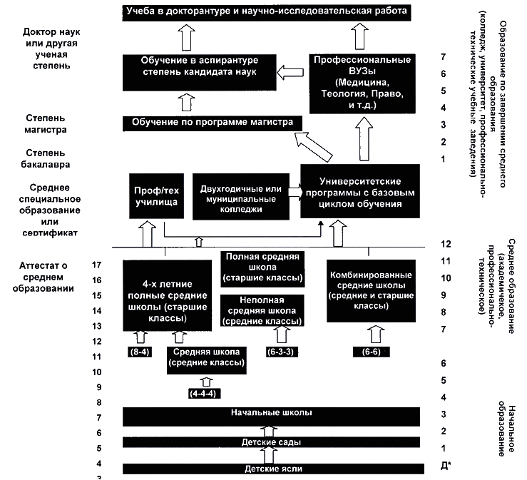 На рисунке представлена структура образования в США, с указанием наиболее типичных способов получения образования, от подготовительных групп до высших учебных заведений.